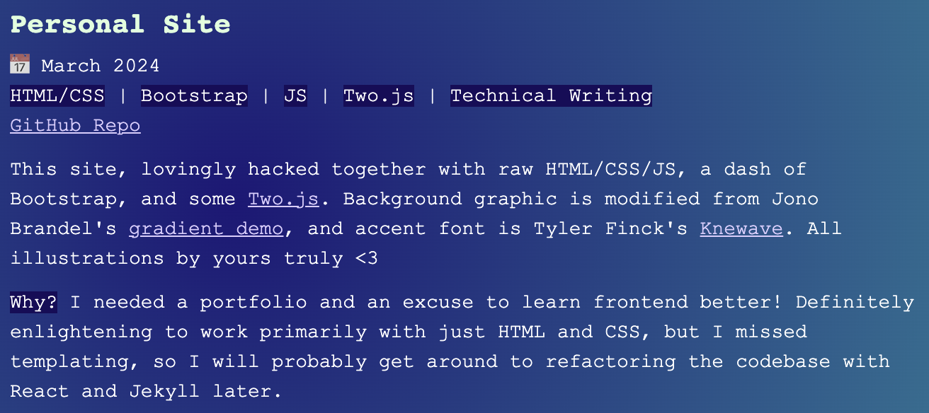 Why? I needed a portfolio and an excuse to learn frontend better! Definitely enlightening to work primarily with just HTML and CSS, but I missed templating, so I will probably get around to refactoring the codebase with React and Jekyll later.