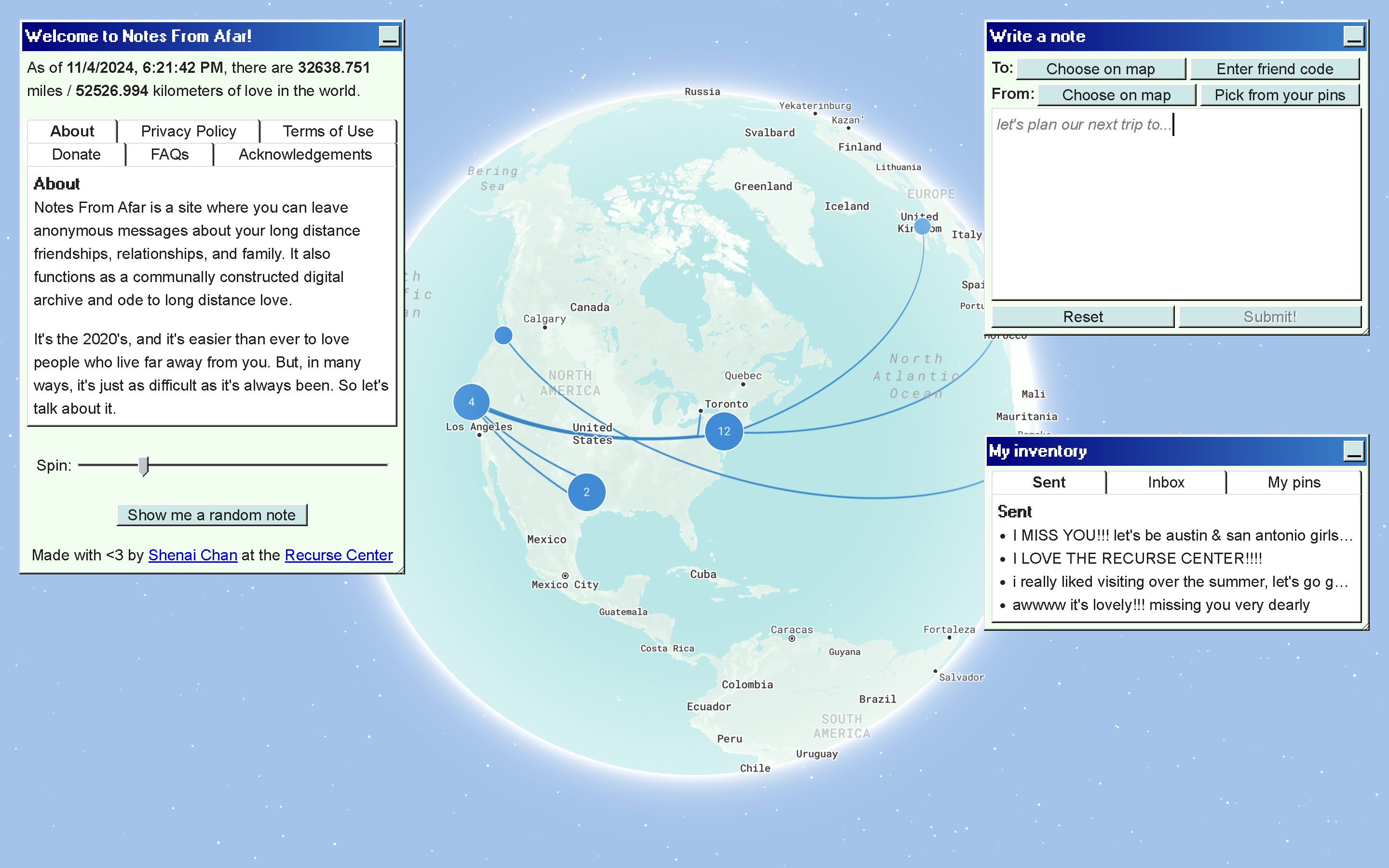 Designed, programmed, user tested, and deployed fully-functional web application where users can leave anonymous notes about their long distance relationships.