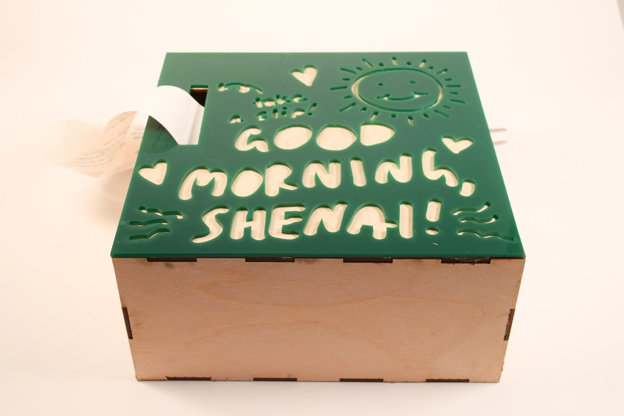 Designed and fabricated device that senses the sound of an alarm and prints from a corpus of poetry to incentivize waking up.
